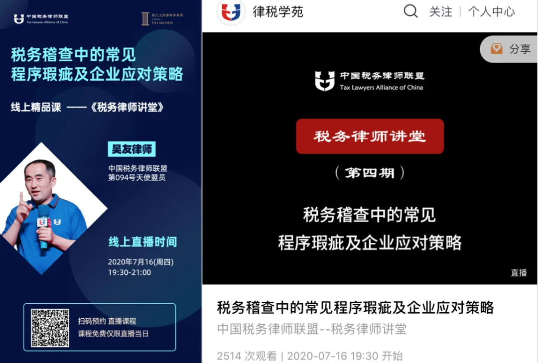本次课程主讲吴友律师是中国税务律师联盟第94号盟员,专业能力扎实,授课风格幽默,课程观看直播人数达2516人。