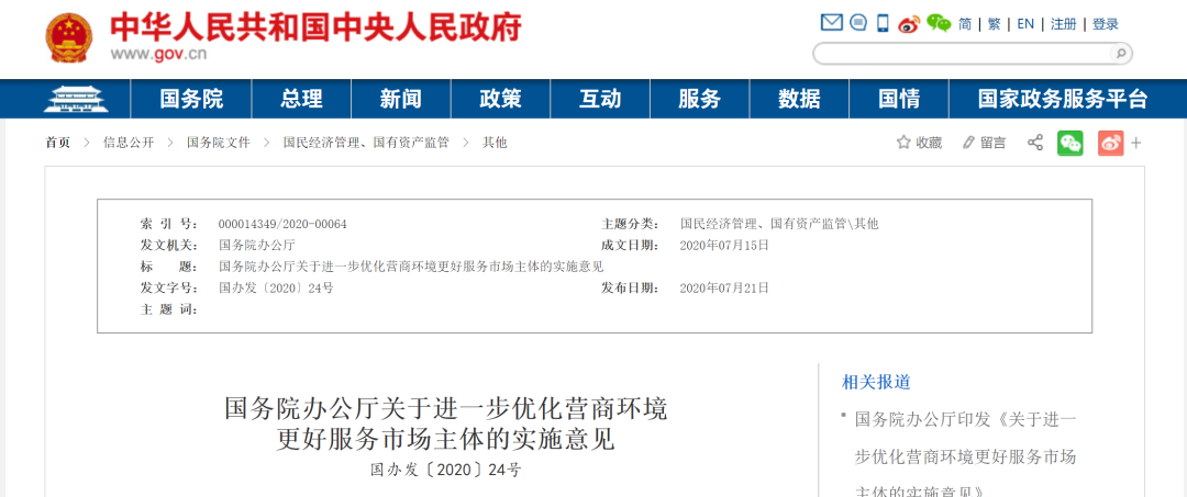 2020年07月21日,国务院办公厅发布文件,持续深化“放管服”改革优化营商环境,更大激发市场活力,增强发展内生动力,内容如下一、提升投资建设便利度:优化再造投资项目前期审批流程,提升工程建设项目审批效率,推进各类相关规划数据合一